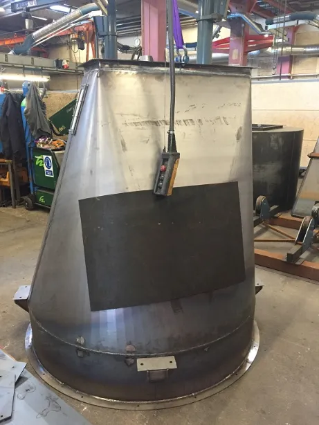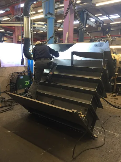 Vi har også lavet den store sorte stålkonstruktion på det andet billede. Den skal bruges i et dåsebehandlingsanlæg hvor der kører rigtige mange dåser igennem pr. time! Efter opsvejsning og slutkontrol skal den overfladebehandles med en speciel lak.